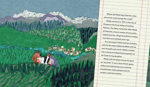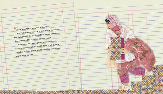 "The story of Malala Yousafzai is a powerful one: she is a living testament to personal strength and the value of education. The young human rights advocate is a true warrior with words, and this up-to-date biography introduces children to her story. For a generation of digital natives, a young woman who expresses herself and elicits change through a blog is both relatable and inspirational. Interspersed with quotes from Yousafzai, the text highlights the important events in her life. From the beginning of her blog until the day of the Taliban’s attempt to assassinate her, and onward through her recovery and up to present day, the thread that weaves the story together is her unwavering support of the right each child has to an education. Roth’s illustrations are composed of beautiful fabric-and-paper collages. There are gorgeous, bright colors throughout, but the Taliban and events involving them are depicted in muted tones of black and gray. The informational pages at the end of the book are not to be missed. Children can learn more about Pakistan, the Taliban, and The Malala Fund. There is even a section that encourages young readers to take action and provides information on how to do so. VERDICT Available in both English and Spanish, this contemporary biography is excellent for conversations about the power of words, resilience, and the ability of one person to inspire meaningful change."