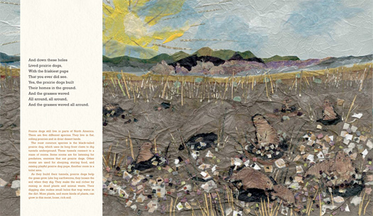 "Following their Sibert Award-winning Parrots Over Puerto Rico, Roth and Trumbore turn to prairie dogs. Each double-page spread includes a collage, a verse from a cumulative song based on "And the Green Grass Grew All Around," and text detailing the evolving history and ecological significance of prairie dogs in North America. The clever layout makes this a book that can grow with its readers. For little ones, the large-print words of the song can be used along with the amazing artwork; older readers can move on to the highly informative, engaging narrative. The song teaches succinctly about the biodiversity of the prairie habitat before farmers and ranchers, the near-extinction of the entire habitat, and the return to biodiversity once the importance of the prairie dogs was recognized. In flowing, conversational language, the text for older readers includes such subjects as 19th-century, government-sanctioned prairie dog poisoning and how, in 1988, the prairie dog was finally recognized as a keystone species—one on which an entire ecosystem depends. The ongoing tale is uplifting, as individual people, organizations, and, finally, the government of Mexico have helped to bring back both the prairie dog and the prairie. [T]he entire book is a worthy work of science-and-arts integration. An inspiration."