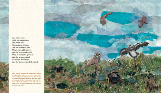 "Roth and Trumbore, the team behind Parrots Over Puerto Rico and The Mangrove Tree, adapt the song “And the Green Grass Grew All Around” in an inspiring environmental comeback story. Early spreads introduce the prairie dogs, owls, bison, and eagles that made their home in the prairies of northern Mexico, until ranchers and farmers turned the grasslands to desert (“And over time/ Mesquite moved in,/ With the longest roots/ That you ever did see”). As locals attempt to restore the grasslands, supplemental paragraphs offer extensive information about the process and animals (as does a substantial afterword). Roth’s meticulously crafted collages create sweeping, gorgeously detailed panoramas of a delicate landscape in flux."